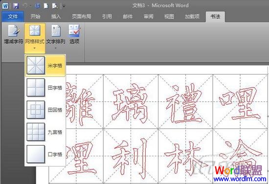 用Word 2010制作字帖,默认网格样式是米字格,可以修改成其它网格样式。单击工具栏上的“书法”按钮,切换到“书法”功能区,单击“网格样式”按钮,可以看到下拉菜单中列出了目前书法字帖中流行的米字格、田字格、田回格、九宫格和口字格等五种网格样式(如图3)。
