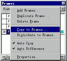 选中新添加的“Frame 4”,将背景图片拷入其中并适当地调整一下背景图片的位置,然后选中图片,单击“Frames”面板右上角如图4按钮,在弹出菜单中选择“Copy to Frames”,进入“Copy to Frames”窗口,选择拷贝范围为:All Frames,单击“ok”按钮 。